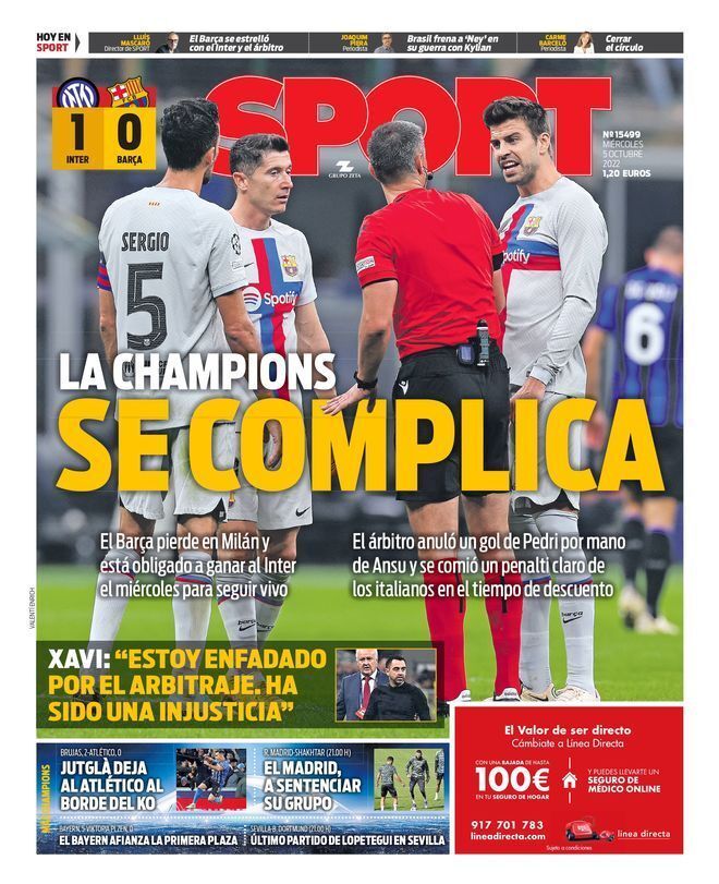 سلطت صحيفة سبورت الضوء في غلافها على خسارة برشلونة من فريق إنتر ميلان بنتيجة هدف دون رد، وخاصة مع شعور لاعبي البلوجرانا بحالة من الظلم التحكيمي في لقاء أمس.