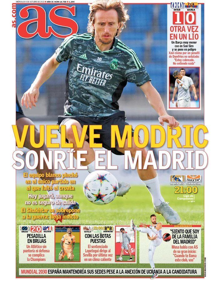عنونت آس في غلافها بـ مودريتش يعود وريال مدريد يبتسم، حيث قالت أن مودريتش غاب عن مباراة واحدة واليوم سوف يعود للعب بالرغم من عدم تأكد مشاركته كأساسي.