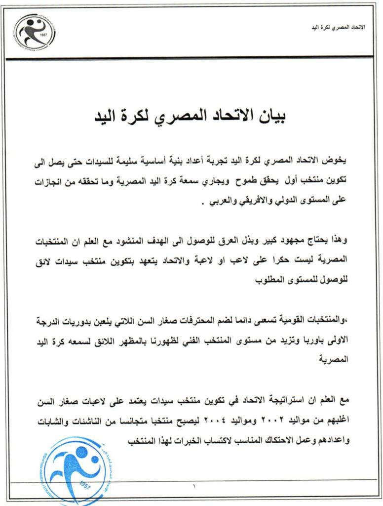 وأضاف الاتحاد المصري لكرة اليد في بيانه: وهذا يحتاج مجهود كبير وبذل العرق للوصول إلى الهدف المنشود، مع العلم أن المنتخبات المصرية ليست حكرا على لاعب أو لاعبة، والاتحاد يتعهد بتكوين منتخب سيدات لائق للوصول للمستوى المطلوب، والمنتخبات القومية تسعى دائما لضم المحترفات صغار السن اللاتي يلعبن بدوريات الدرجة الأولى بأوروبا، وتزيد من مستوى المنتخب الفني لظهورنا بالمظهر اللائق لسمعة كرة اليد المصرية.
