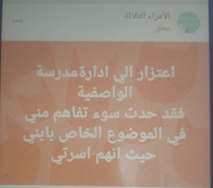 لم تمر ساعات على الواقعة حتى نشرت ولي الأمر بوست آخر، تعتذر فيه لإدارة المدرسة، وتؤكد خلاله أن ما حدث سوء تفاهم، وتضمن البوست: اعتذار إلى مدرسة الواصفية فقد حدث سوء تفاهم مني في الموضوع الخاص بأبني حيث أنهم أسرتي.