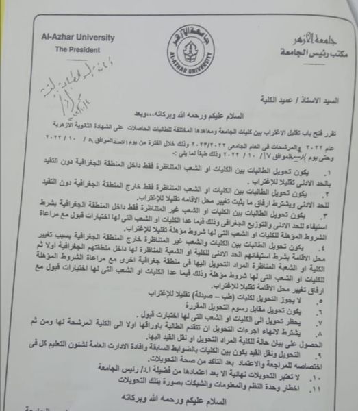 4- يكون تحويل الطالبات بين الكليات والشعب غير المتناظرة خارج المنطقة الجغرافية بسبب تغيير محل الإقامة بشرط استيفائهم الحد الأدنى للكلية أو الشعبة المناظرة لها داخل منطقتهم الجغرافية أولا ثم الكلية أو الشعبة المناظرة المراد التحويل إليها في منطقة جغرافية أخرى مع مراعاة الشروط المؤهلة للكليات أو الشعب التي لها شروط مؤهلة وذلك فيما عدا الكليات أو الشعب التي لها اختبارات قبول مع إرفاق تغییر محل الإقامة تقليلا للاغتراب.