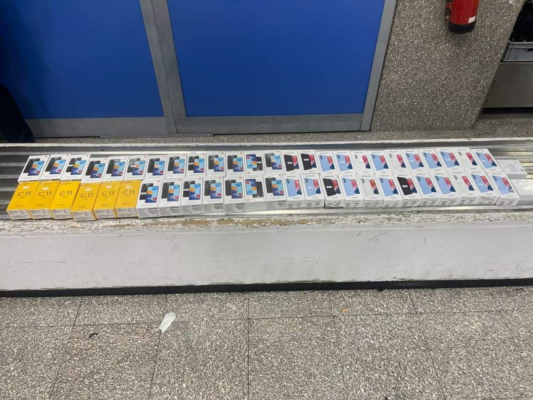 وتم تمرير حقائبه على جهاز الفحص بأشعة X-RAY فتلاحظ وجود أشياء تكرارية متماثلة، وبتفتيش حقائب الراكب فتبين وجود حوالي 52 هاتف محمول ماركات متنوعة مخبأة بين طيات الملابس داخل حقائبه.