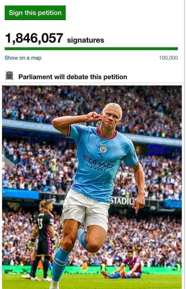 وبحسب صحيفة Sport Bible، فإن هناك أكثر من مليون و800 ألف مشجع في الدوري الإنجليزي من المواطنيين البريطانيين، وقعوا على عريضة لترحيل هالاند من إنجلترا وعرضها على البرلمان، باعتباره ليس بشريًا وأنه روبوت، وذلك بعد المستويات الرائعة التي يقدمها النجم النرويجي مع السيتيزن منذ انتقاله بداية الموسم الحالي قادمًا من بوروسيا دورتموند.