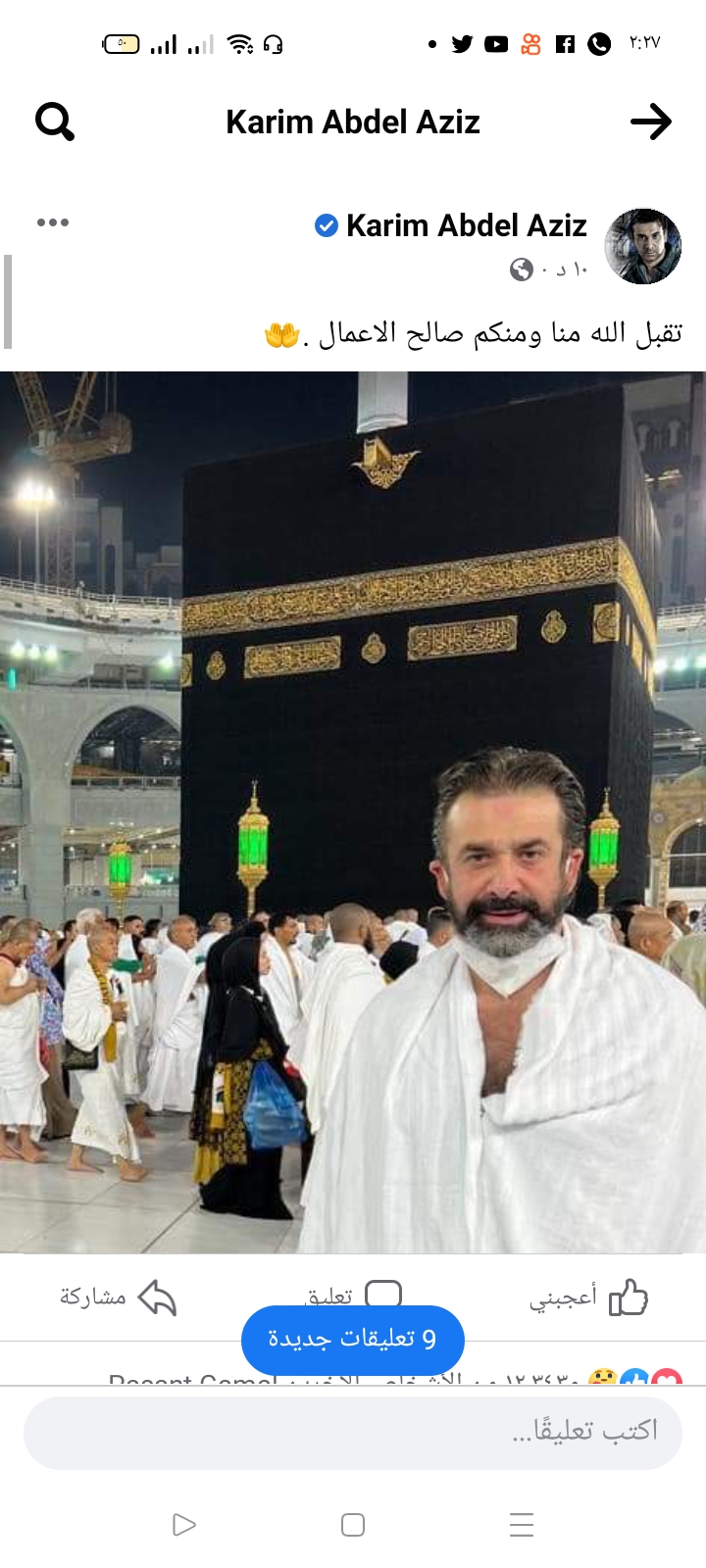 وشارك كريم عبد العزيز، متابعيه بصورة، عبر حسابه الشخصي بموقع فيس بوك، وهو يؤدي مناسك العمرة، وعلق عليها قائلا: تقبل الله منا ومنكم صالح الأعمال.