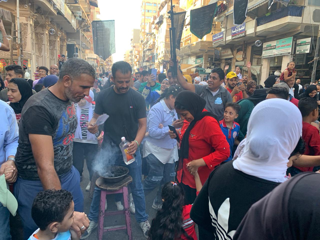 والقي عددًا من سكان شارع الثلاثيني وأصحاب المحال التجارية الحلوى والملبس على المحتفلين، وذلك لإدخال البهجة والفرحة والسعادة علي المشاركين.