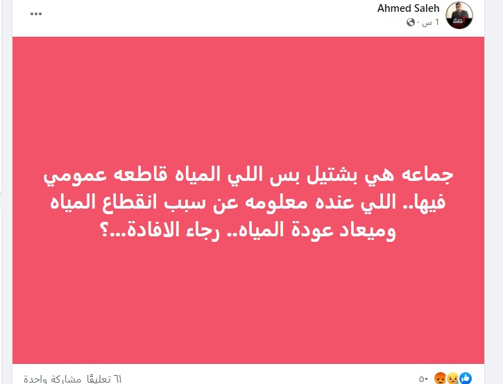 كما اشتكى أيضًا نشطاء مواقع السوشيال ميديا متسائلين عن سبب انقطاع المياه، حيث كتب أحد الحسابات: “جماعه هي بشتيل بس اللي المياه قاطعه عمومي فيها.. اللي عنده معلومة عن سبب انقطاع المياه وميعاد عودة المياه.. رجاء الافادة...؟”، وتفاعل معاه سكان المنطقة بعدم معرفتهم لهذا السبب وان الأمر أثر أزمة يومهم.