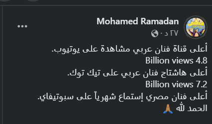 ونشر محمد رمضان صورة له وهو يحتفل بنجاح أغانيه عبر جميع مواقع الموسيقى المختلفة، وذلك من خلال حسابه الشخصي بموقع التواصل الاجتماعي فيس بوك، إذ قال: أعلى قناة فنان عربي عبر يوتيوب 4 بلايين و800 مليون مشاهدة، أعلى هاشتاج فنان عربي عبر تيك توك 7 بليون و200 مليون مشاهدة، أعلى فنان مصري استماع شهريًا على سبوتيفاي.