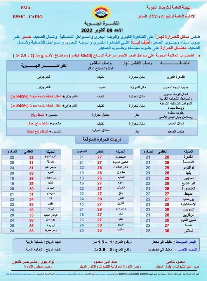 أعلنت الهيئة العامة للأرصاد الجوية، تفاصيل حالة الطقس التي تشهدها البلاد خلال يوم غدا الأحد، الموافق 9 أكتوبر 2022، وسط توقعات بسقوط الأمطار على بعض المناطق.
