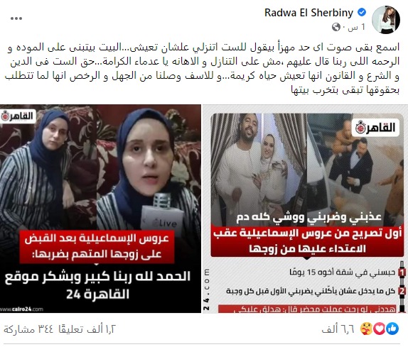 واستعانت رضوى الشربيني، بتغطية القاهرة 24، لواقعة عروس الإسماعيلية، وكتبت عبر حسابها الشخصي بموقع التواصل الاجتماعي فيس بوك: أسمع بقى صوت أي حد مهزأ بيقول للست اتنازلي علشان تعيشي.. البيت بيتبني على المودة والرحمة اللي ربنا قال عليهم، مش على التنازل والإهانة يا عدماء الكرامة.. حق الست في الدين والشرع والقانون إنها تعيش حياة كريمة.. وللأسف وصلنا من الجهل والرٌخص إنها لما تتطلب بحقوقها تبقى بتخرب بيتها.