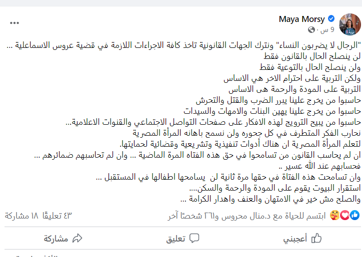وتابعت مرسي، خلال منشور لها على موقع التواصل الاجتماعي فيسبوك: التربية على المودة والرحمة هي الأساس، حاسبوا من يخرج علينا يبرر الضرب والقتل والتحرش، حاسبوا من يخرج علينا يهين البنات والأمهات والسيدات، حاسبوا من يبيح الترويج لهذه الأفكار على صفحات التواصل الاجتماعي، والقنوات الإعلامي.