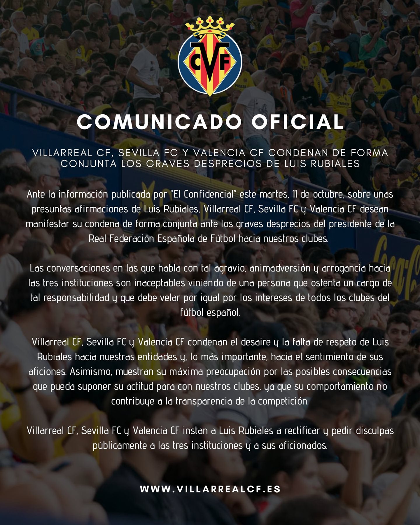 تطلب أندية اشبيلية، فالنسيا وفياريال من رئيس الاتحاد الاسباني لويس روبيالِس الخروج والاعتذار لما قاله حولنا في المحادثة المسربة، حيث أن الأندية الثلاثة قلقة حول العواقب المحتملة نتيجة موقفه اتجاههم ويعتبرون أن سلوكه لا يساهم في شفافية المنافسة.