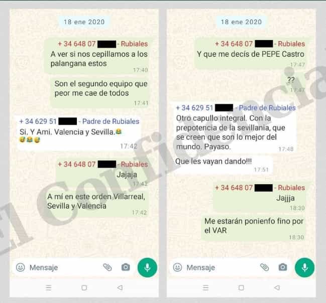 وتعود المحادثات المسربة إلى عام 2020، خلال مباراة إشبيلية ضد ريال مدريد، والتي قال خلالها لويس روبياليس إلى والده دعنا نهزم إشبيلية، إنه ضمن الأندية التي نكرهه في الليجا مع فياريال وفالنسيا.
