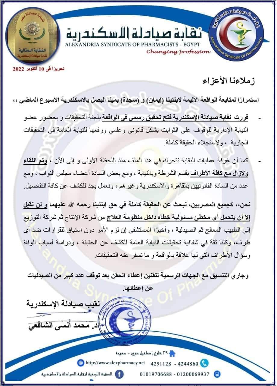 قررت نقابة صيادلة الإسكندرية، فتح تحقيق رسمي في واقعة وفاة الطفلتين إيمان وسجدة بمينا البصل، بلجنة التحقيقات وبحضور عضو النيابة الإدارية للوقوف على الثوابت بشكل قانوني وعلمي ورفعها للنيابة العامة في التحقيقات الجارية، ولاستجلاء الحقيقة كاملة.