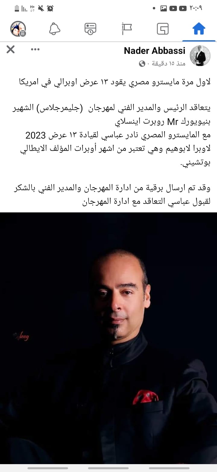 وكتب المايسترو نادر عباسي منشور عبر حسابه الشخصي على موقع التواصل الاجتماعي فيس بوك أعلن فيه عن قيادته لهذا العرض قائلا: يتعاقد روبرت اينسلاي الرئيس والمدير الفني لمهرجان جليمر جلاس الشهير بنيويورك مع المايسترو المصري نادر عباسي لقيادة 13 عرضا 2023 لأوبرا لابوهيم وهي تعتبر من أشهر أوبرات المؤلف الإيطالي بوتشيني.