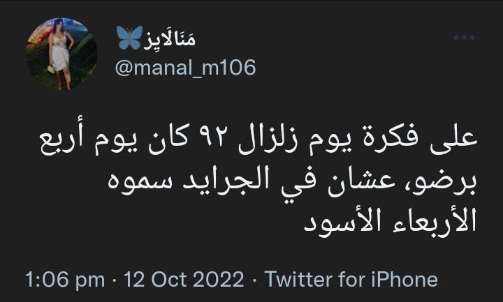 وقال آخر: على فكرة يوم زلزال 92 كان يوم أربع برضو، عشان في الجرايد سموه الأربعاء الأسود.
