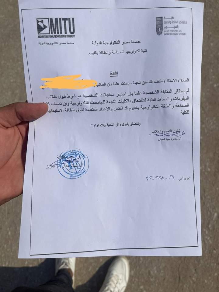 واستغاث أوائل شهادات الدبلومات والمعاهد الفنية عبر منشور لهم على صفحات موقع التواصل الاجتماعي فيس بوك، قائلين: نستغيث بعد تعمد رسوبهم الجماعي في المقابلات الشخصية بالجامعات التكنولوجية التي تم إنشاؤها خصيصًا لهم، حيث يتم طبقًا لقرار الإنشاء قبول 80 % من المتقدمين من الدبلومات والمعاهد الفنية ونسبة 20 % من الثانوية العامة فقط.