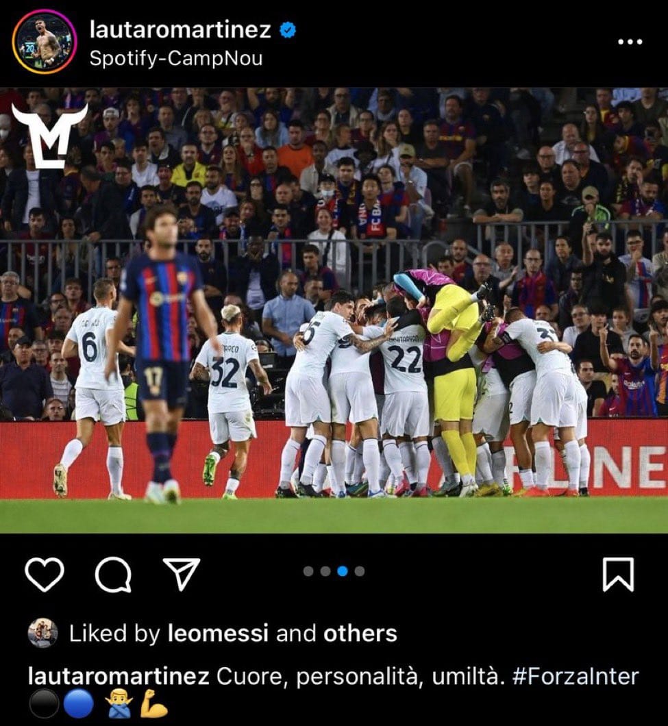 وقام النجم الأرجنتيني ليونيل ميسي، بالإعجاب بمنشور مواطنه لاوتارو مارتينيز، والذي نشر مجموعة من الصور، عبر حسابه الرسمي على موقع التواصل الاجتماعي إنستجرام، بعد تعادل إنتر ميلان أمام برشلونة.
