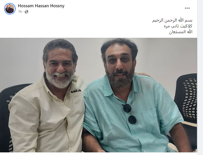 ونشر حسام حسني، صورة تجمعه مع الفنان محسن محيي الدين من الكواليس، عبر حسابه الشخصي بموقع التواصل الاجتماعي فيسبوك، وعلق عليها قائلًا: بسم الله الرحمن الرحيم كلاكيت تاني مرة الله المستعان.