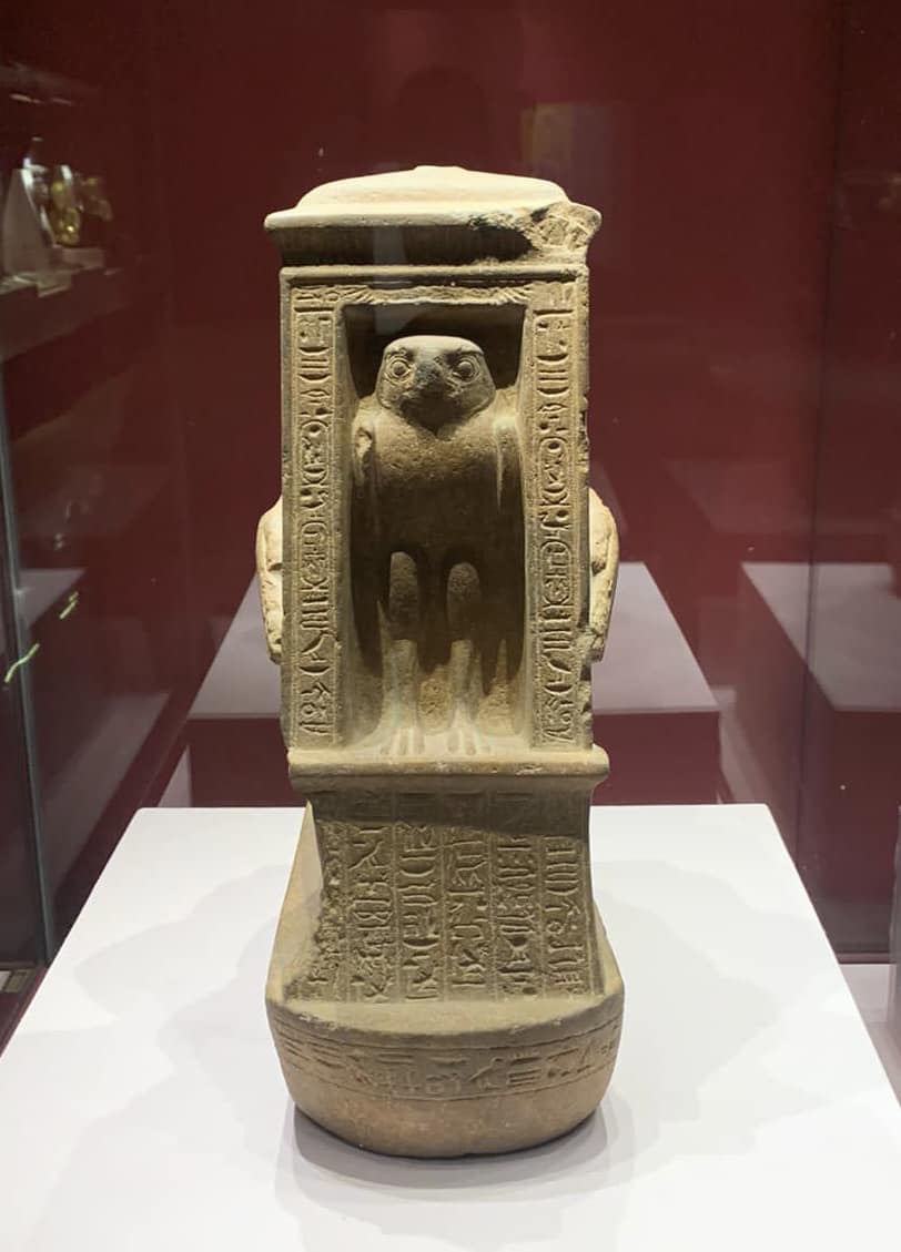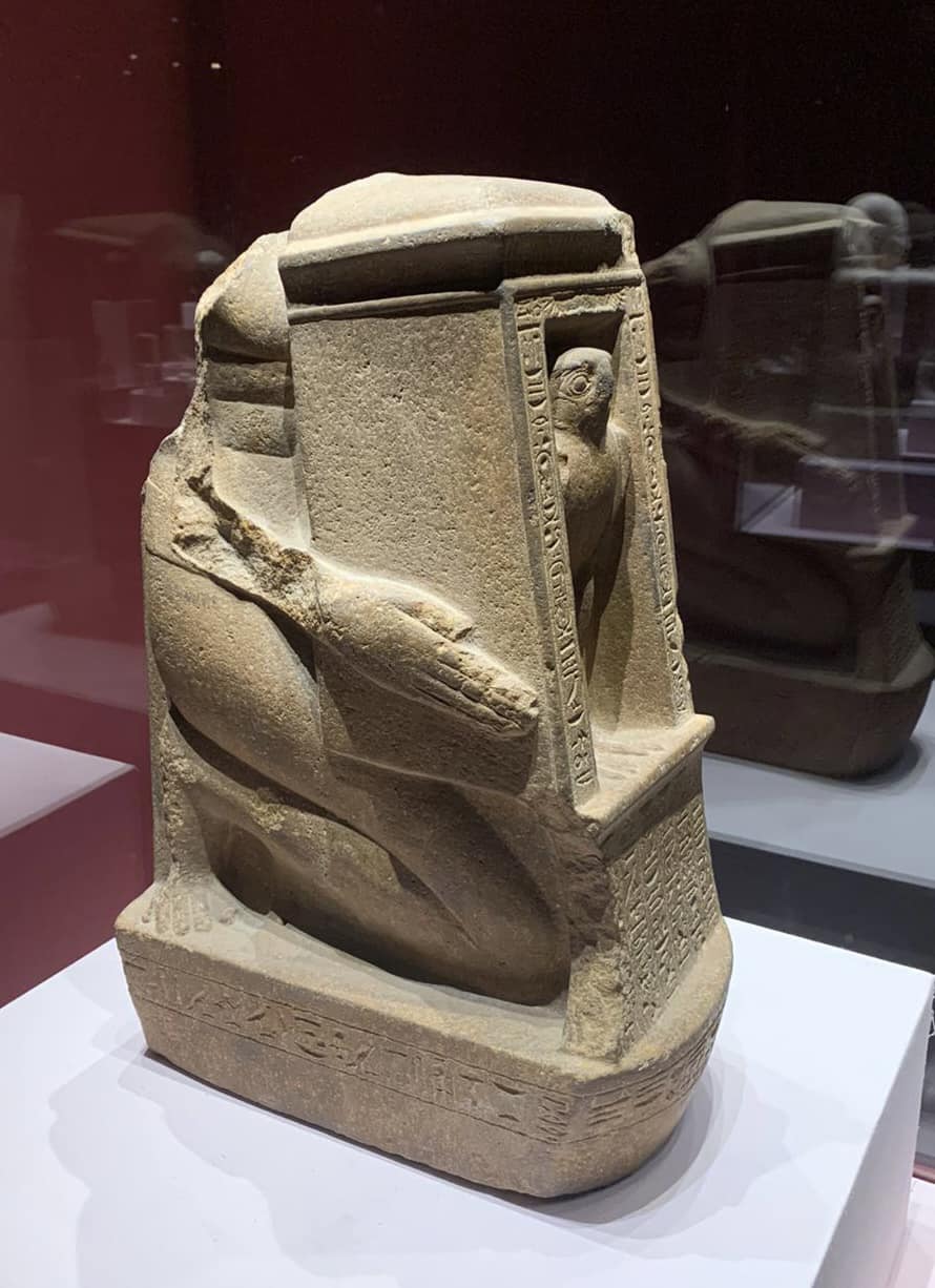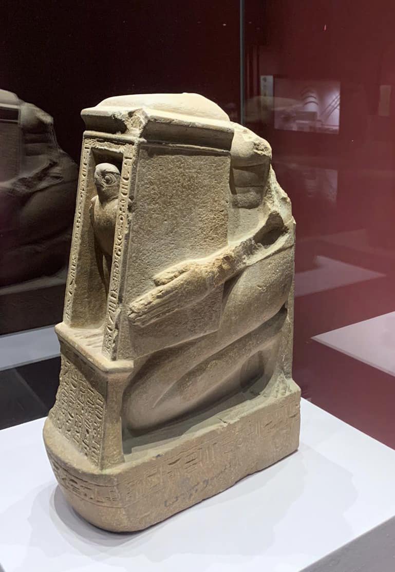 وأبدع الفنان المصري القديم في التفاصيل والنقوش على الناووس، حيث يمثل هذا التمثال رجلًا راكعًا فاقد الجزء العلوي ويدعى سبتي ويحتضن بين ذراعيه ناووسًا صغيرًا للمعبود حورس الممثل علي هيئة الصقر، وشكل الفنان الصقر ونحته بكل دقة وتعمد إظهار الأعين الواسعة والنظرة الحادة الثاقبة والتركيز علي توضيح شكل المخالب مما يظهر قوة المعبود حورس أمام زوار المعبد أثناء تأدية الطقوس الدينية.