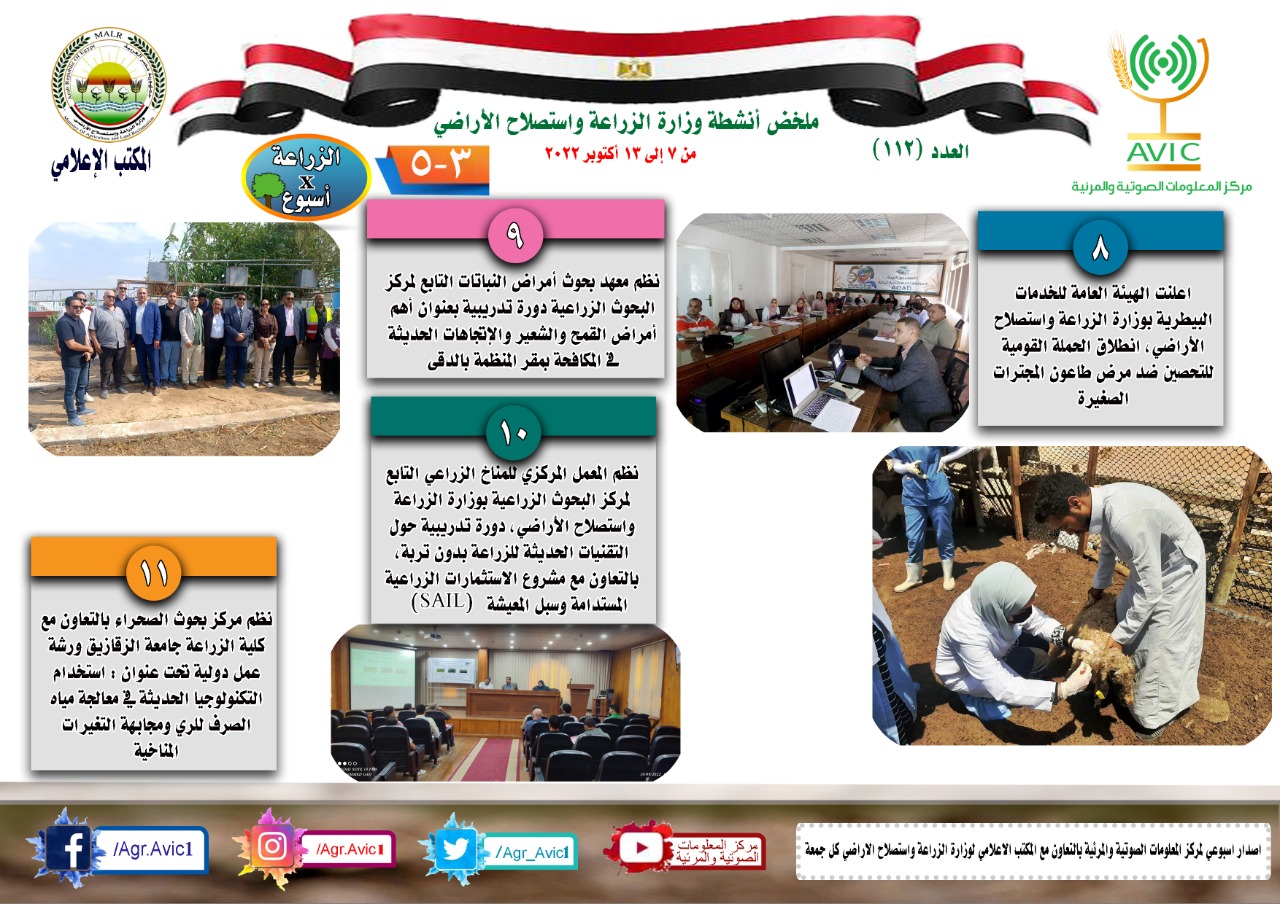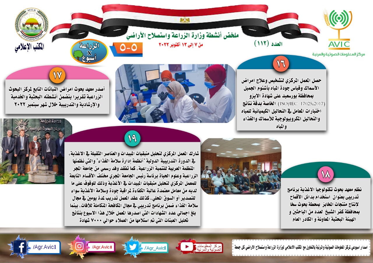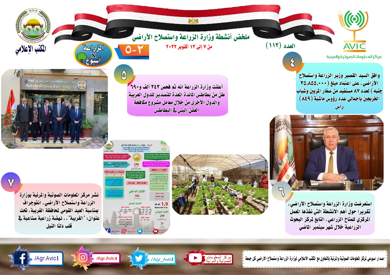 أصدر مركز المعلومات الصوتية والمرئية، التابع لوزارة الزراعة واستصلاح الأراضي، الإنفوجراف الأسبوعي، في نسخته رقم 112، حول الحصاد الأسبوعي لأهم أنشطة الوزارة، خلال الأسبوع الماضي في الفترة من 7 وحتى 13 أكتوبر الجاري، وذلك بالتعاون مع المكتب الاعلامي للوزارة.