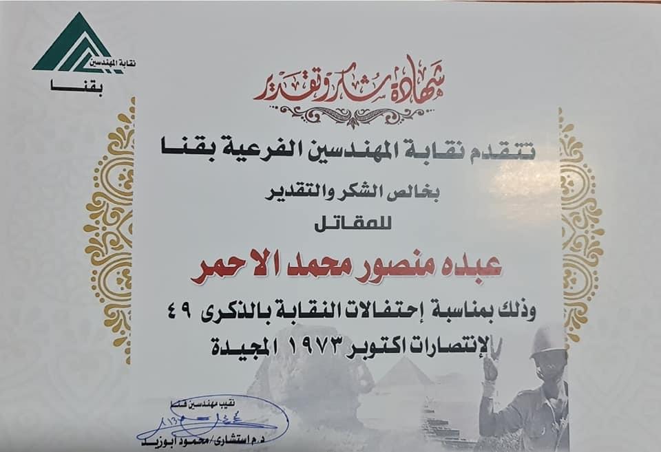 وقال محمود أبوزيد، نقيب مهندسين قنا، إن الفقيد كان حسن الخلق وسمعته طيبة بين أهالي مدينة قنا، وكرمته نقابة المهندسين بقنا أول أمس بصفته بطل مقاتل وقائد سرية في الإسماعلية أثناء حرب أكتوبر 1973.