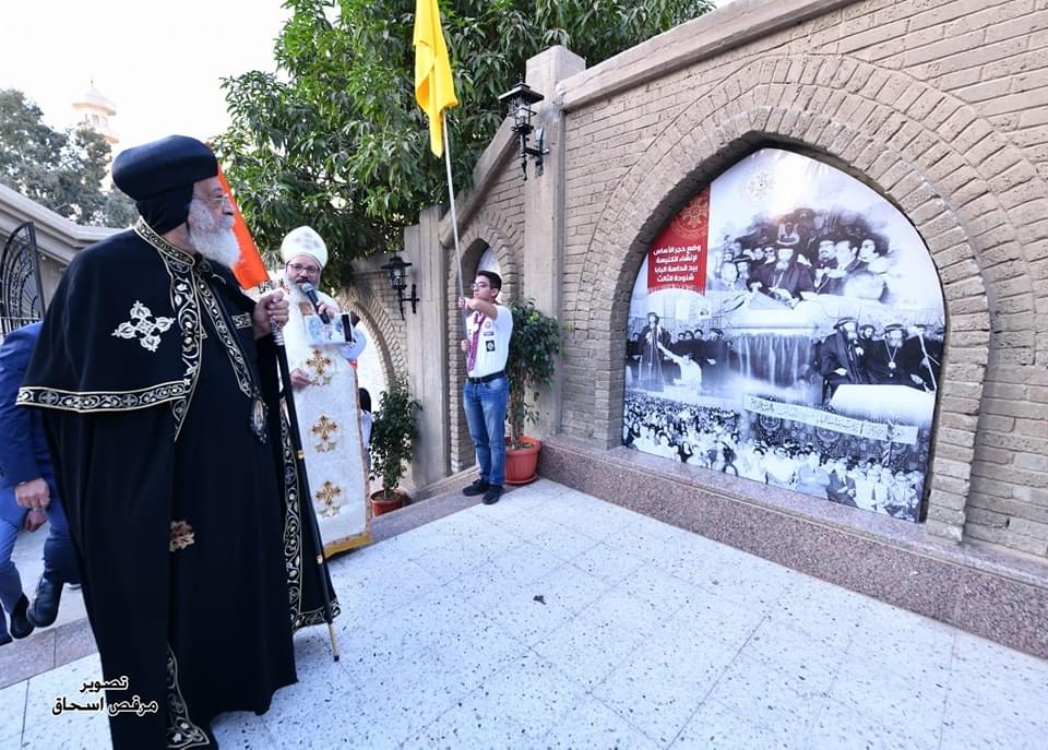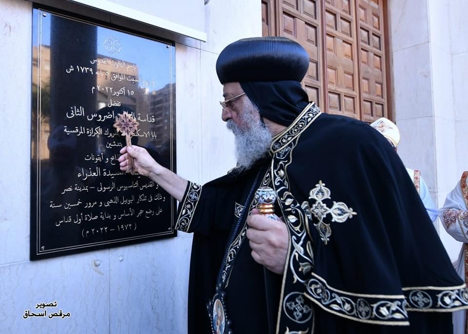 وأزاح قداسة البابا الستار لدى وصوله إلى الكنيسة، عن اللوحة التذكارية التي تؤرخ لتدشينها، والتُقطت له صور تذكارية أمام اللوحة والآباء الأساقفة المشاركين في الصلوات، والآباء كهنة الكنيسة، وذلك قبل الدخول إلى الكنيسة.