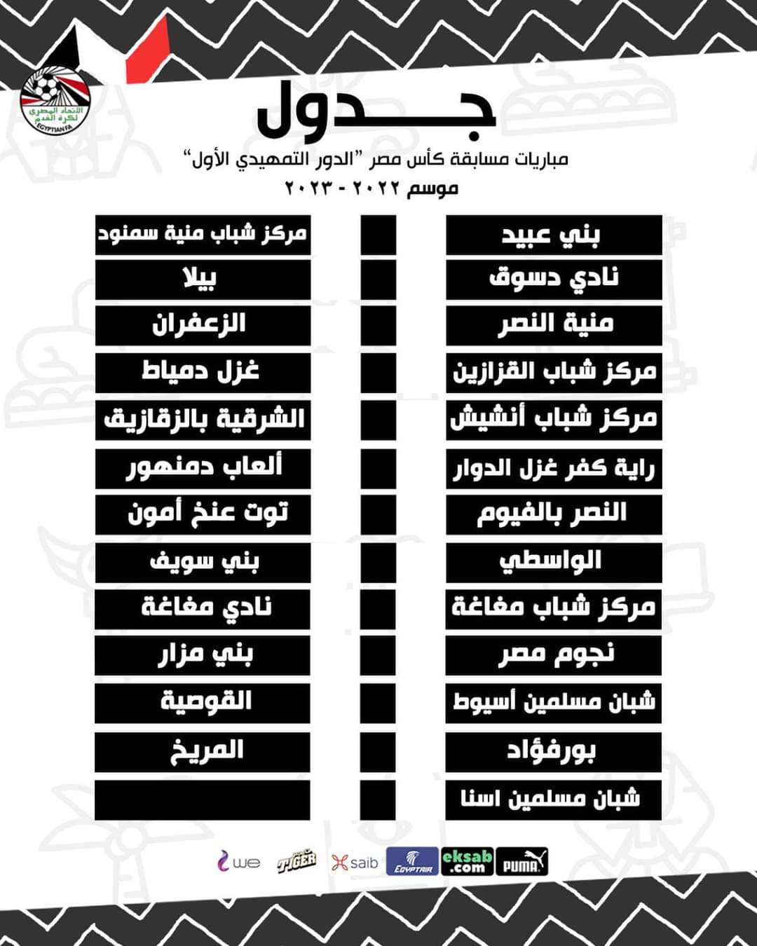وأسفرت قرعة الدور التمهيدي لكأس مصر عن المواجهات التالية: