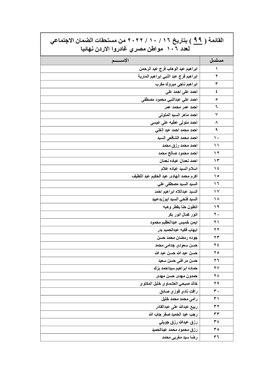 نجح مكتب التمثيل العمالي التابع لوزارة القوى العاملة بالسفارة المصرية بالعاصمة الأردنية عمان، والتابع مع المسئولين بمؤسسة الضمان الاجتماعي بالأردن، في تحويل القائمة الـ 99 من مستحقات الضمان الاجتماعي لنحو 106 عامل مصري لدى المؤسسة غادروا عمان نهائيا، وجاء ذلك استكمالا لما تم تحويله سابقا.