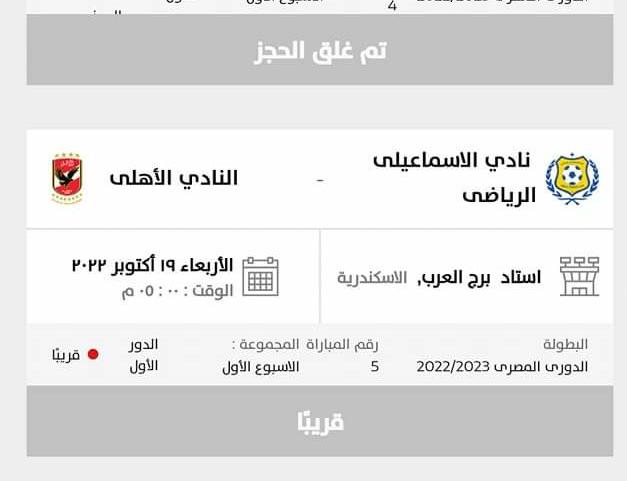 وظهر عبر الموقع الرسمي لشركة تذكرتي ستاد برج العرب ملعبًا للمباراة، وهو من يستضيف مباراة الدراويش أمام المارد الأحمر، حيث كان مجلس إدارة الإسماعيلي قدم طلبا لخوض المباراة في السويس أو القاهرة في استاد الكلية الحربية، لكن موقع تذكرتي حسم الأمر بنشر اسم الملعب على قسم الحجز.