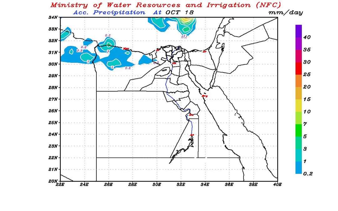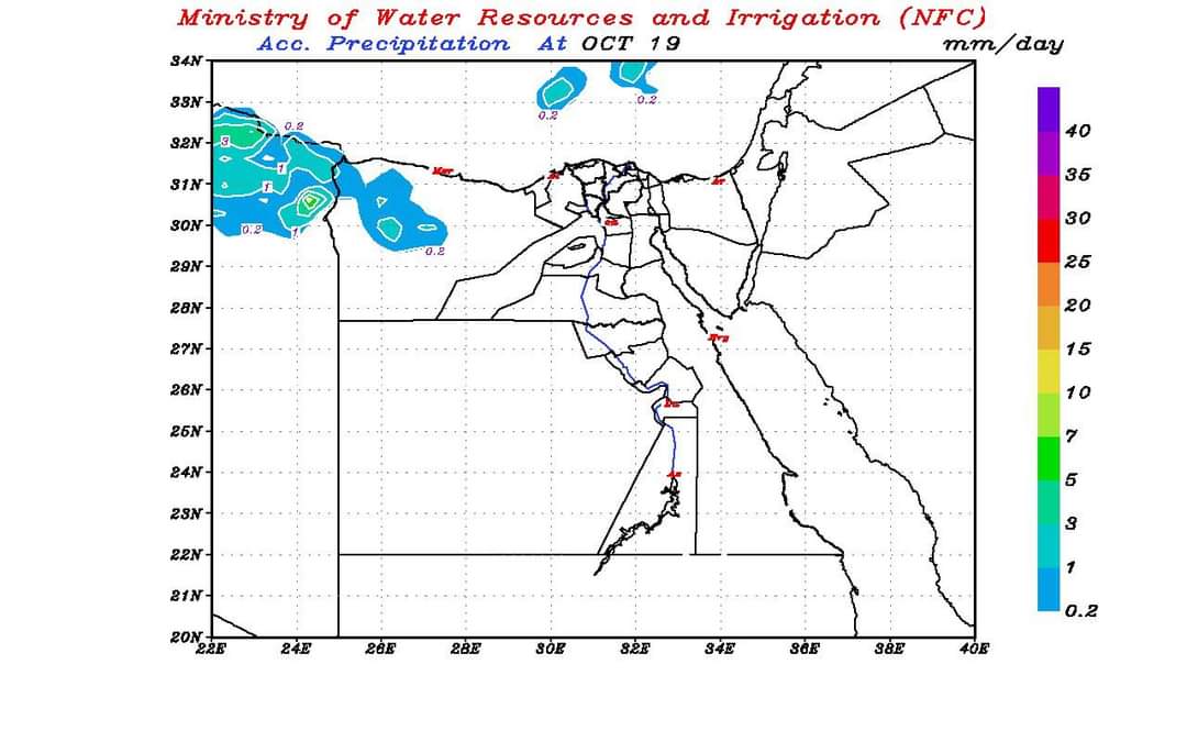 وعن توقعات يوم الأربعاء المقبل 19 أكتوبر توقع مركز التنبؤ بالفيضان، أنه قد تتعرض مناطق من أقصى السواحل الشمالية والغربية لسقوط أمطار خفيفة تصل حدتها لنحو 1 مم.