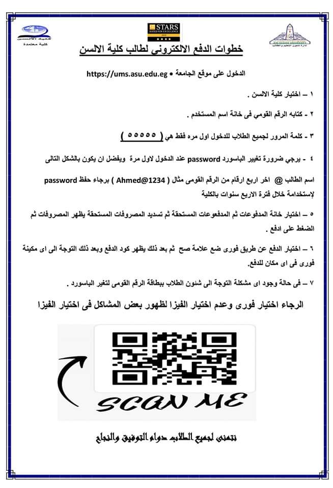 وكتبت كلية الألسن بـ جامعة عين شمس عبر صفحتها الرسمية على موقع التواصل الاجتماعي فيسبوك، منشورًا جاء مضمونه: إنه يمكن سداد المصروفات الدراسية لـ جميع الطلاب من خلال الدخول على موقع الجامعة.