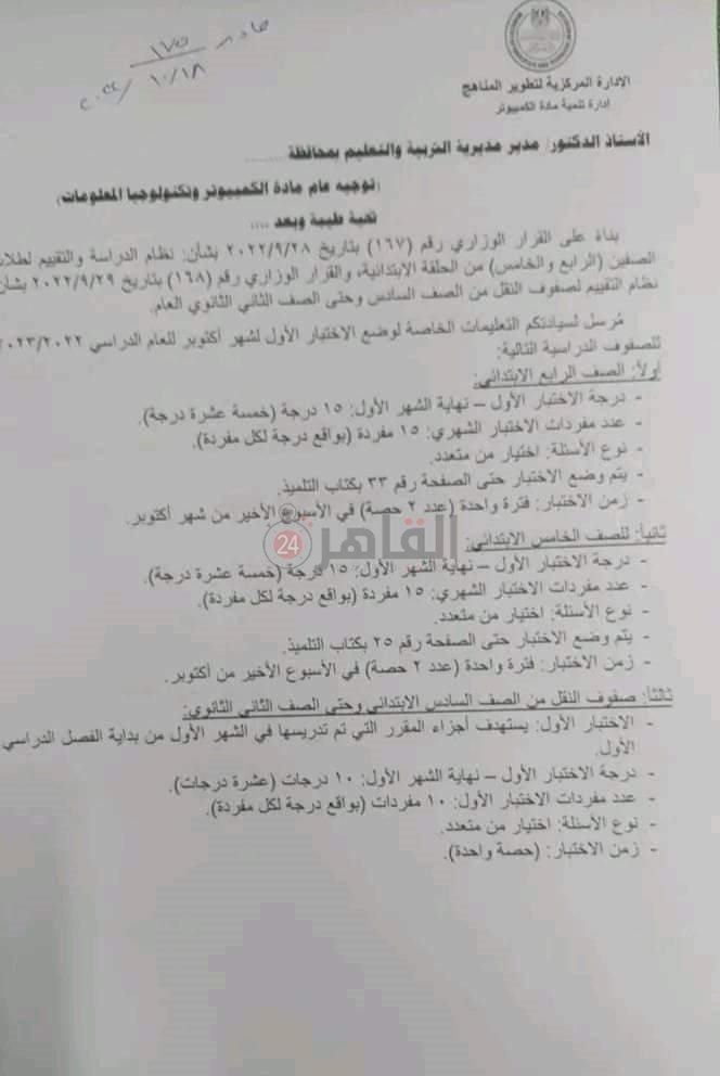 وحصل القاهرة 24، على نسخة من خطاب الإدارة المركزية لتطوير المناهج للمديريات التعليمية بشأن وضع الاختبار الأول لشهر أكتوبر للعام الدراسي 2022-2023 للصفوف الدراسية.
