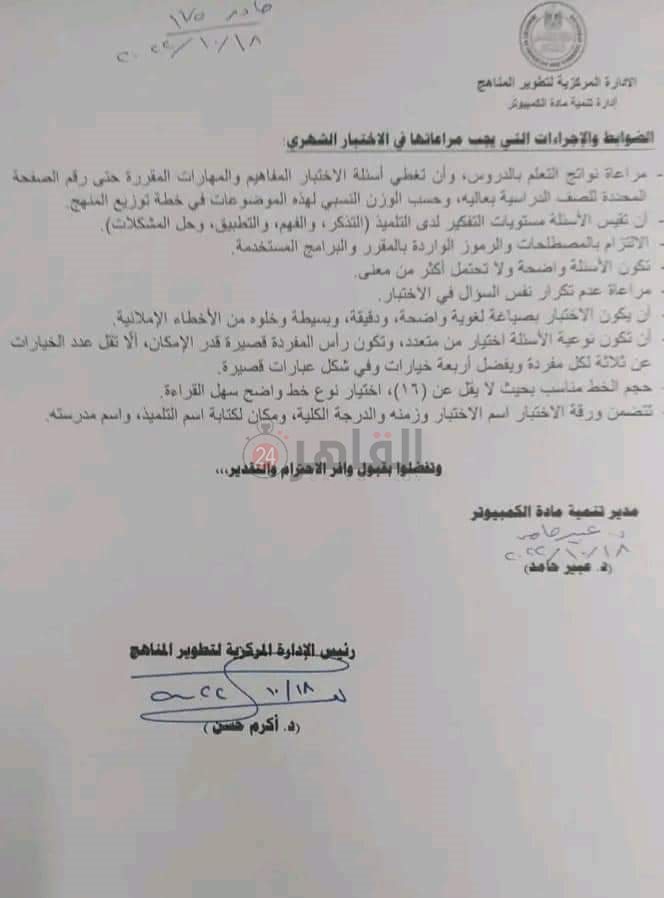 وجهت وزارة التربية والتعليم والتعليم الفني، من خلال الإدارة المركزية لتطوير المناهج، خطابًا لجميع المديريات التعليمية، بشأن ضوابط وضع امتحان الشهر لمادة الكمبيوتر لجميع صفوف النقل وجميع المراحل.