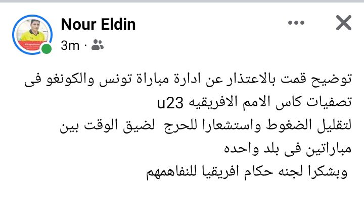 وكتب إبراهيم نور الدين عبر صفحته الشخصية على فيسبوك: قمت بالاعتذار عن مباراة تونس والكونغو، لتقليل الضغوط واستشعار الحرج لضيق الوقت بين مباراتين في بلد واحدة.. وأشكر لجنة الحكام لتفهمهم.