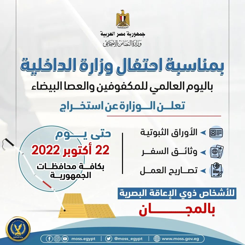 وقالت وزارة التضامن الاجتماعي، في منشور لها غبر صفحتها الرسمية بموقع التواصل الاجتماعي فيس بوك، إنه بمناسبة احتفال وزارة الداخلية باليوم العالمي للمكفوفين والعصا البيضاء، وتنفيذا لتوجيهات وزير الداخلية بتفعيل الدور المجتمعي والإنساني لهيئة الشرطة لتجسيد جانب المسئولية الاجتماعية تجاه فئات المجتمع لا سيما الأشخاص ذوي الإعاقة البصرية، أعلنت وزارة الداخلية عن استخراج «الأوراق الثبوتية، وثائق السفر وتصاريح العمل» للأشخاص ذوي الإعاقة البصرية بالمجان حتى يوم 22 أكتوبر 2022 بكافة نطاق الجمهورية.