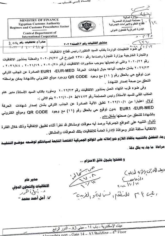بحسب مستند حصل القاهرة 24 على نسخة منه، يتم تطبيق الآلية الصادرة على الجانب التركي بشأن إصدار شهادات الحركة EUR1، وEUR – MED التي تشمل المواصفات الصناعية والجمركية، والإقرارات اللازمة لعملية الاستيراد والتصدير، بدون توقيع حي بالحقل رقم 11 مع وجود QR CODE وموقع الكتروني بالشهادة للتحقق من صحتها بشكل دائم، اعتبارا من شهر أكتوبر الحالي.