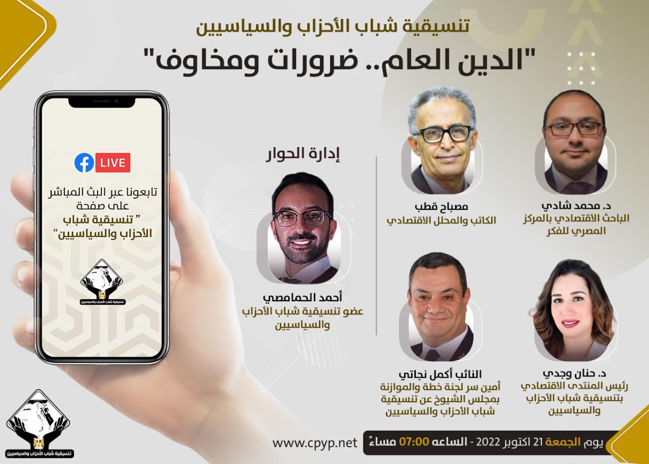 ينظم صالون تنسيقية شباب الأحزاب والسياسيين جلسة نقاشية، السابعة مساء اليوم الجمعة، بعنوان الدين العام: ضرورات ومخاوف.
