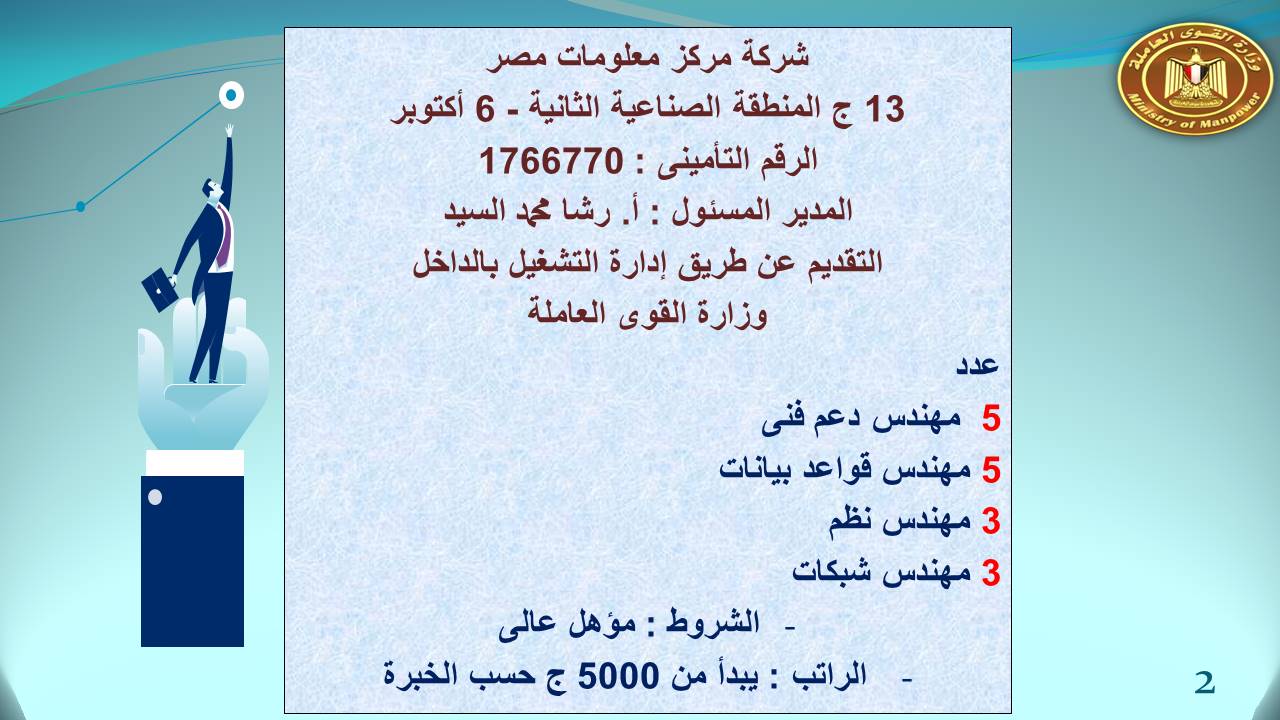 أعلنت إدارة التشغيل بالداخل بوزارة القوى العاملة، عن توفير 16 فرصة عمل للشباب خريجى كليات الهندسة من أقسام الدعم الفني، وقواعد البيانات، والنظم والشبكات، وذلك للعمل بشركة مركز معلومات مصر بمدينة 6 أكتوبر بالمنطقة الصناعية الثانية، وذلك في إطار جهود الوزارة لتوفير فرص عمل لائقة وحقيقية للشباب بمنشآت القطاع الخاص والاستثمارى بالمحافظات.
