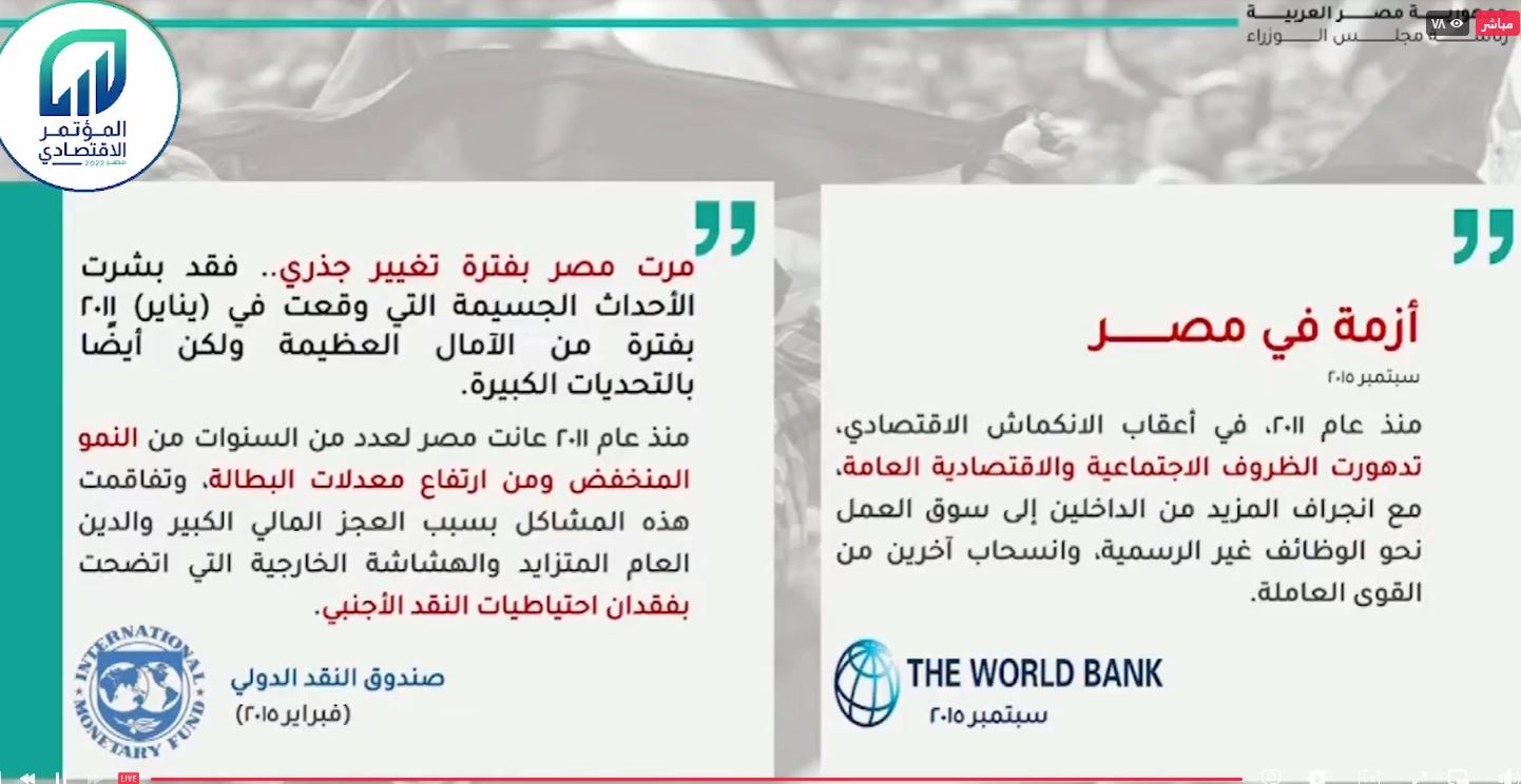ولفت مدبولي، خلال كلمته، إلى حديث صندوق النقد الدولي عن أداء الاقتصاد المصري، ودخول الاقتصاد في انكماش وتدهور الظروف الاجتماعية والاقتصادية وتراجع قدرة العمل وتراجع التصنيف الائتماني 6 مرات في 8 أشهر ووصول الديون لـ516 مليار جنيه.
