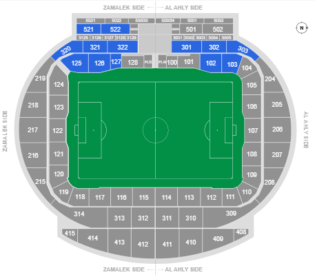 ونفدت تذاكر الثالثة شمال المخصصة لجماهير النادي الأهلي، كما نفدت تذاكر الثالثة يمين المخصصة لجمهور نادي الزمالك، وتتبقى بعض المقاعد الفارغة في المستوى الأول والثالث والخامس مثلما يظهر بالصورة التالية.