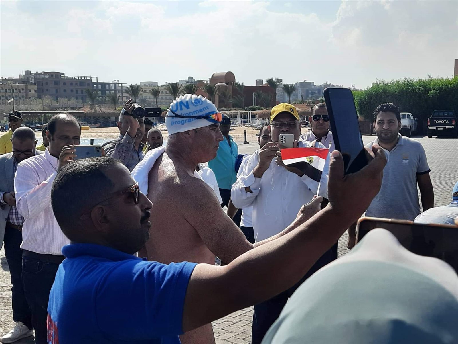 من جانبه قال اللواء محمد البنداري السكرتير العام لمحافظة البحر الأحمر، خلال استقباله، أن رحلة السباحة هي الأولى من نوعها، وتقام تزامنًا مع قمة المناخ المقرر إقامتها بمدينة شرم الشيخ، مضيفًا: هناك اهتمام من أجهزة الدولة بمؤتمر قمة المناخ (27 COP) بمدينة شرم الشيخ، والذي تشارك فيه مختلف الدول.