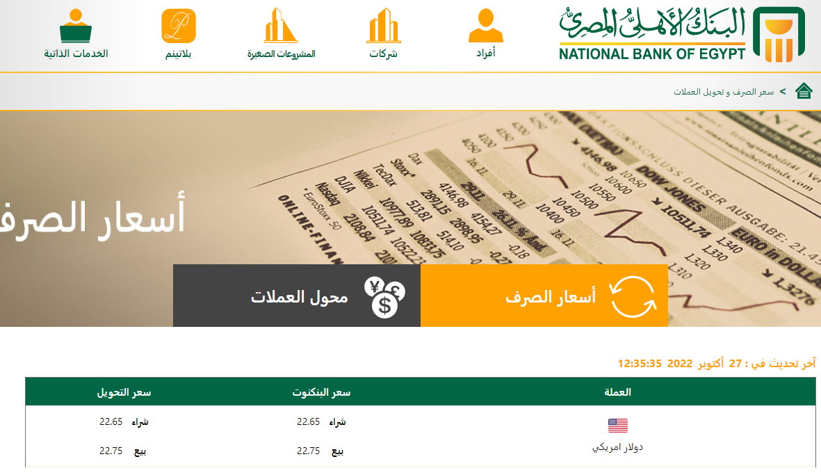 سجّل سعر الدولار اليوم مقابل الجنيه المصري في البنك الأهلي المصري 22.65 جنيه للشراء، و22.75 جنيه للبيع.