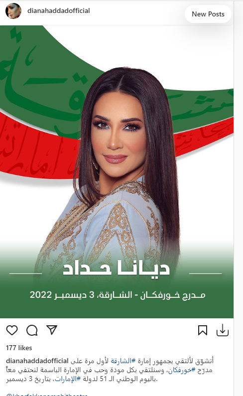وروجت ديانا حداد لحفلها في الإمارات، عبر حسابها الشخصي على موقع تبادل الصور والفيديوهات القصيرة انستجرام، وعلقت قائلةً: أتشوق لألتقي بجمهور إمارة الشارقة لأول مرة على مدرج خورفكان، وسنلتقي بكل مودة وحب في الإمارة الباسمة لنحتفي معًا باليوم الوطني الـ 51 لدولة الإمارات، بتاريخ 3 ديسمبر.
