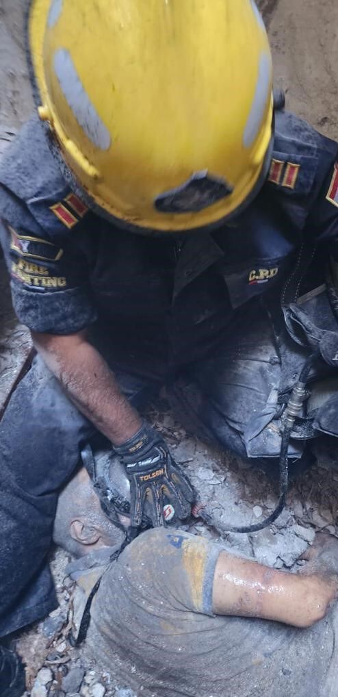وقامت قوات إدارة الحماية المدنية بتقديم المساعدة اللازمة له وإمداده بجهاز التنفس الخاص بسيارة الإطفاء وذلك حال تواجده أسفل الأنقاض، حتى تمكنت القوات من استخراجه وتبين إصابته بكسور وكدمات بالجسم، وقد لاقى سرعة الاستجابة للبلاغ وعملية الإنقاذ استحسان الأهالي بالمنطقة.