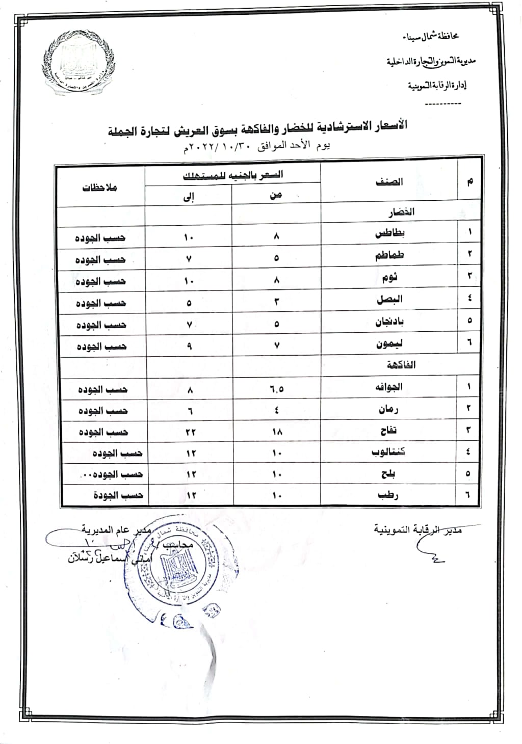 أعلنت مديرية التموين والتجارة الداخلية بشمال سيناء، أسعار الخضروات والفاكهة اليوم الأحد، بسوق الجملة بالعريش.