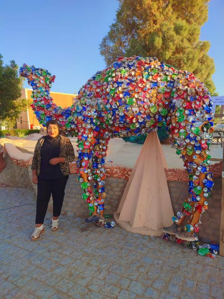 وأضافت: الجمل كان متكسر ومتبهدل، فرممته ولزقت الكانز عليه، وجمعت البلاستيك من كل مكان وعملت بيه الكرة الأرضية، ووزيرة البيئة أشادت به لما شافته، ومحافظ شرم الشيخ دعمني كتير فيه.
