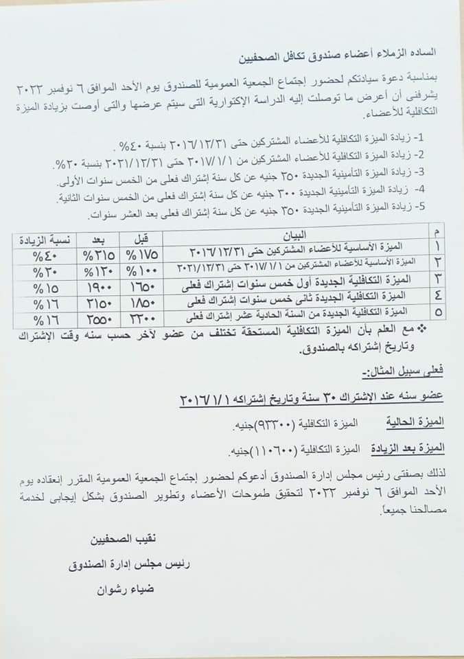 أعلن ضياء رشوان نقيب الصحفيين، عقد جمعية عمومية للزملاء أعضاء صندوق تكافل الصحفيين، يوم الأحد الموافق 6 نوفمبر 2022.