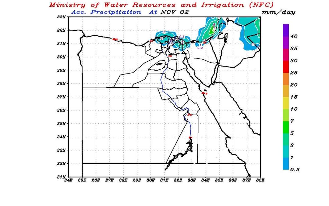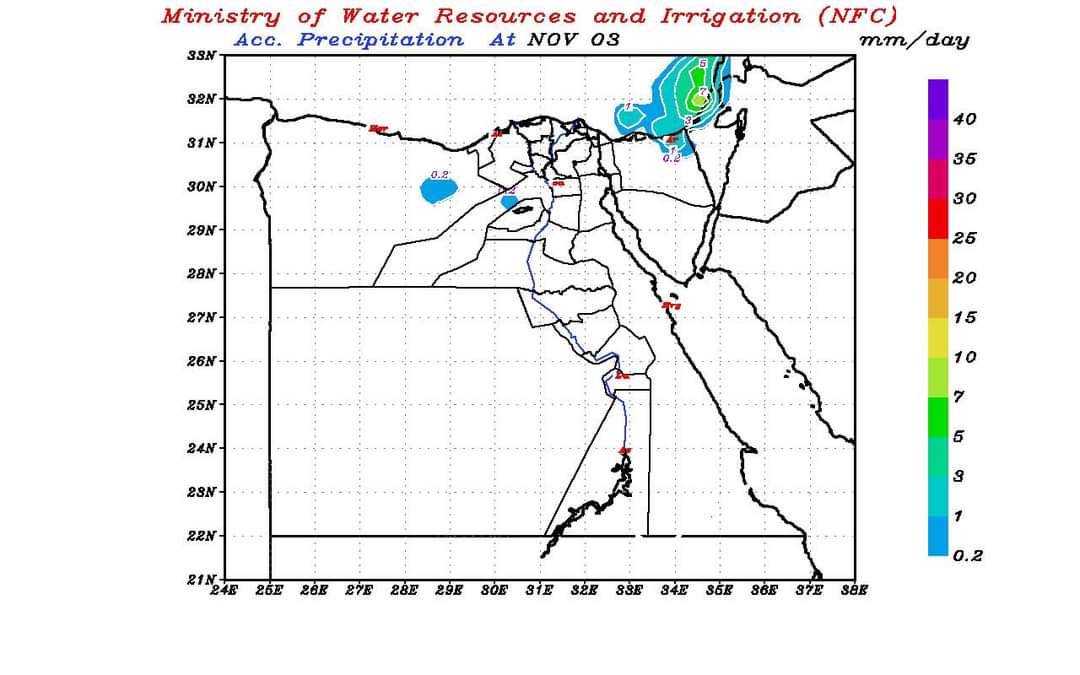 أما يوم الخميس 3 نوفمبر، فتوقع مركز التنبؤ بالفيضان، أن يشهد سقوط أمطار خفيفة على القاهرة وأقصى السواحل الشمالية الشرقية.