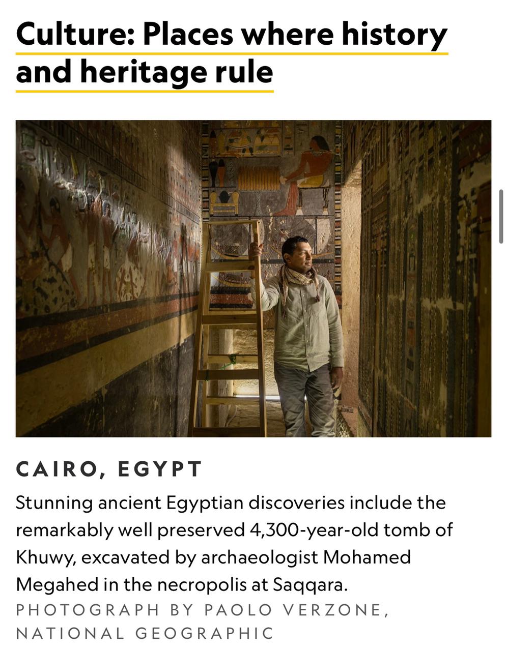 نشر موقع ناشيونال جيوجرافيك تقريرًا مصورًا تحت عنوان: 25 مكانًا وتجربة مذهلة لعام 2023، ضم قائمة بأفضل المقاصد السياحية في العالم لعام 2022، والتي أوصى بزيارتها في عام 2023، حيث جاء المقصد السياحي المصري ضمن هذه القائمة.