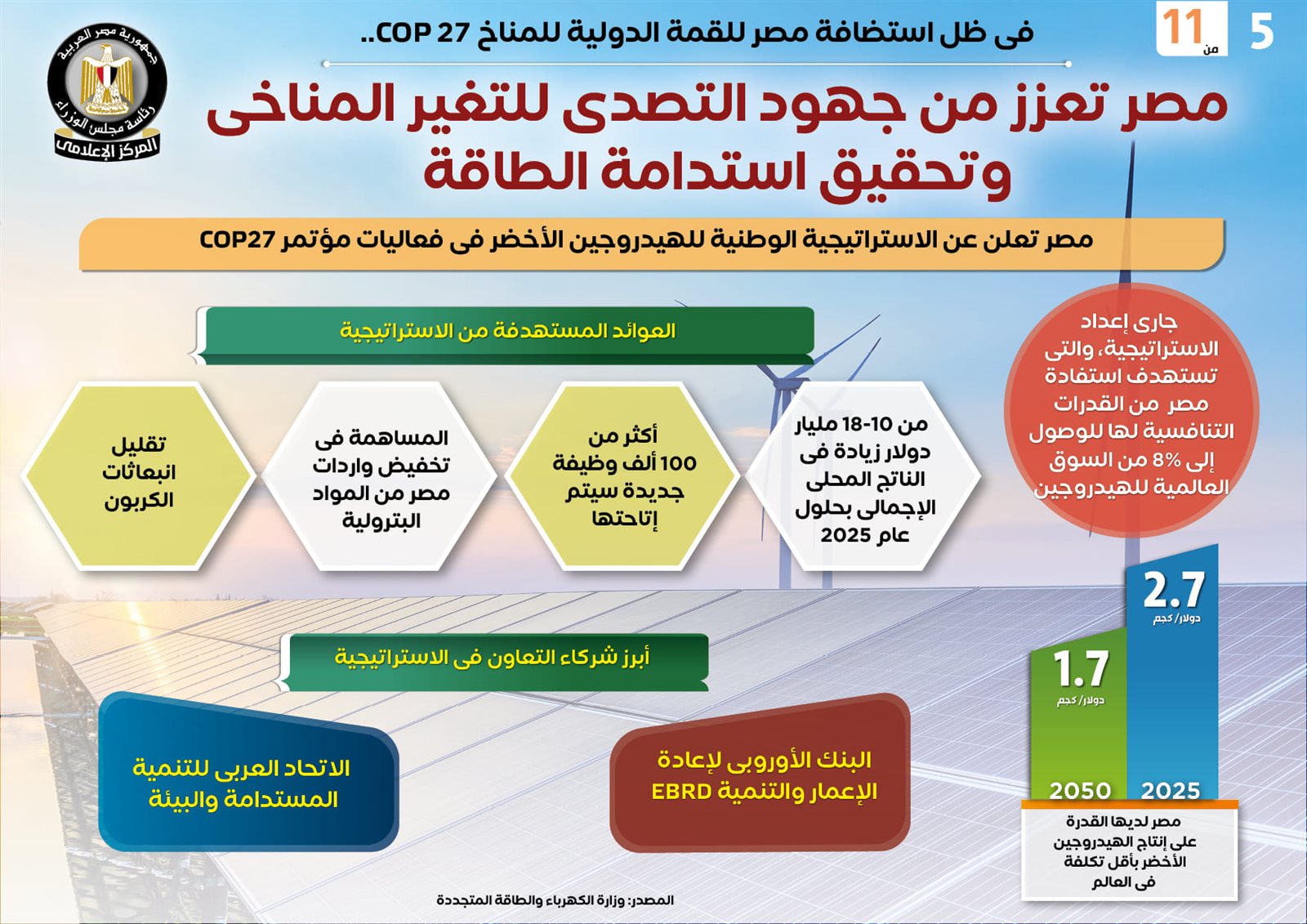 نشر المركز الإعلامي لمجلس الوزراء تقريرًا تضمن إنفوجرافات تسلط الضوء على خطط مصر لتعزيز جهود التصدي للتغير المناخي وتحقيق استدامة الطاقة، في ظل استضافة مصر للقمة الدولية للمناخ COP 27.